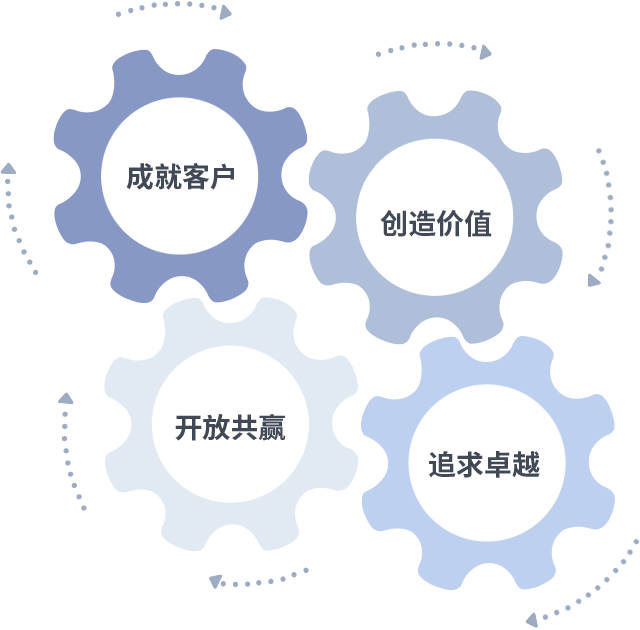 成就客户是一切决策的出发点,,,,创造价值是衡量所有工作的标准,,,,追求卓越是我们做事做人的态度,,,,开放共赢是我们的格局也是最终的结果。。。价值观的齿轮环环相扣,,,,推动着组织里的每个人不断向前。。。